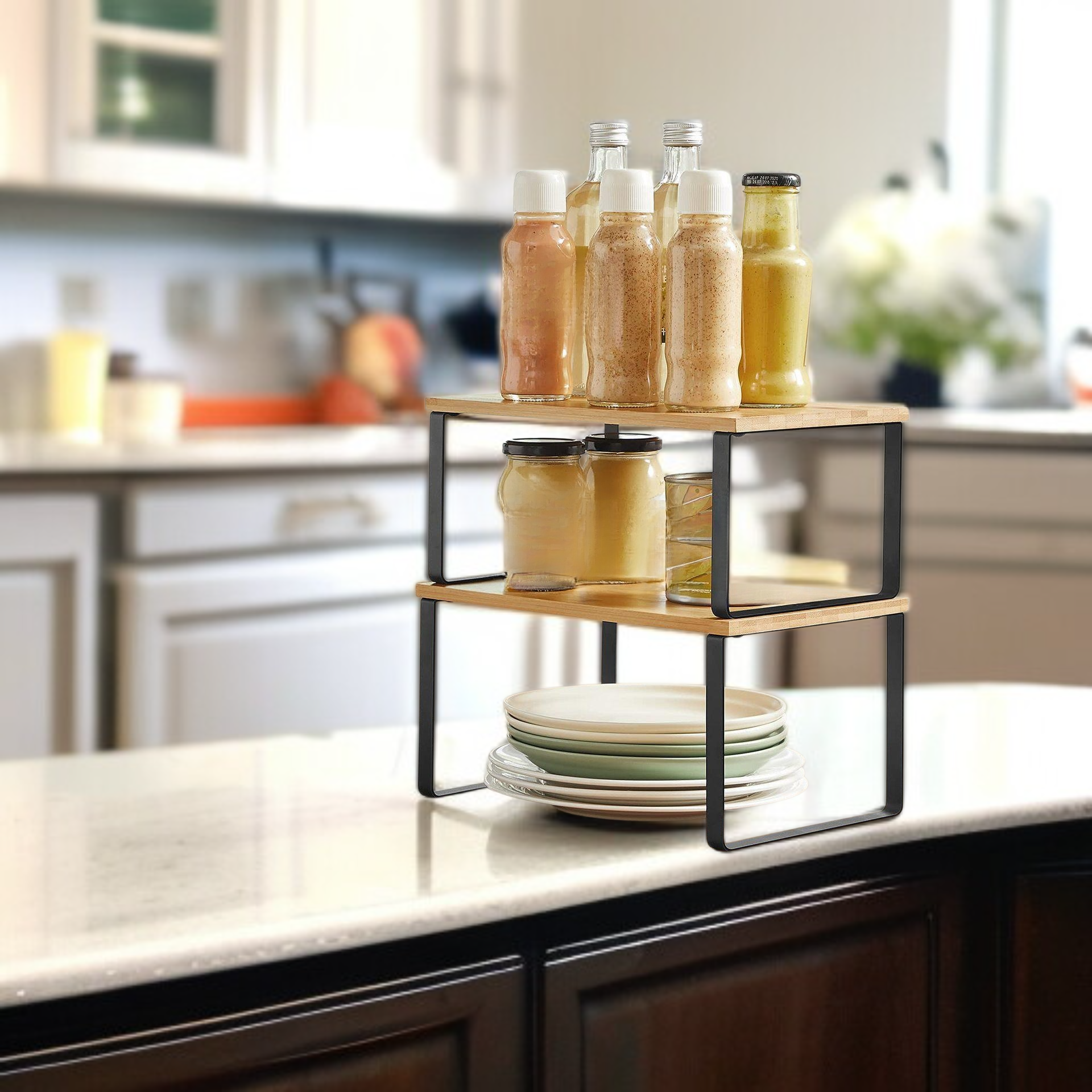 ● 주방 공간을 효율적으로 활용할 수 있는 2단 적층형 디자인으로, 각종 양념통과 그릇을 깔끔하게 정리할 수 있습니다.